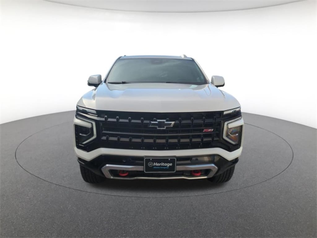 License Plate Front Mounting Package, Preferred Equipment Group 2Z7 (1st and 2nd Row Color-Keyed Carpeted Floor Mats, 2-Speed Active Electronic AutoTrac Transfer Case, 3-Spoke Wrapped Steering Wheel, 3rd Row Manual 60/40 Split-Folding Bench Seats, Auto-Dimming Inside Rear-View Mirror, Black Tubular Assist Steps, Bright Front and Rear Door Sill Plates, Color-Keyed Carpeting Floor Covering, Dual Exhaust System, Floor Console with Storage Area, Front Bucket Seats, Front High-Approach Angle Fascia, Front LED Fog Lamps, Front Pedestrian and Bicyclist Braking, Frontal Driver and Outboard Passenger Airbags, Hill Descent Control, Memory Settings For Driver, Rear Power Liftgate, Red Horizontal-Mounted Recovery Hooks, Remote Start, SiriusXM with 360L Trial Subscription, Universal Home Remote, USB Ports, Wheels: 20" x 9" Bright Machined Aluminum, Wireless Phone Charging, and Z71 Exterior Features), Balance of Factory Warranty, 4WD, Black Leather, 2-Way Power Driver Lumbar Seat Adjuster, 2-Way Power Front Passenger Lumbar Seat Adjuster, 3.23 Rear Axle Ratio, 3rd row seats: split-bench, 4-Wheel Disc Brakes, 6 Speakers, 6-Speaker Audio System Feature, 8-Way Power Driver Seat Adjuster, 8-Way Power Front Passenger Seat Adjuster, ABS brakes, Air Conditioning, Alloy wheels, AM/FM radio: SiriusXM with 360L, Apple CarPlay/Android Auto, Auto High-beam Headlights, Auto-dimming Rear-View mirror, Automatic temperature control, Brake assist, Bumpers: body-color, Compass, Delay-off headlights, Driver door bin, Driver vanity mirror, Dual front impact airbags, Dual front side impact airbags, Electronic Stability Control, Emergency communication system: OnStar and Chevrolet connected services capable, Exterior Parking Camera Rear, Four wheel independent suspension, Front anti-roll bar, Front Center Armrest, Front dual zone A/C, Front fog lights, Front reading lights, Fully automatic headlights, Garage door transmitter, Heated door mirrors, Heated Driver and Front Passenger Seats, Heated front seats, Illuminated entry, Leather-Appointed Seat Trim, Low tire pressure warning, Memory seat, Navigation system: Google built-in compatibility (select service plan required, terms and limitations apply), Occupant sensing airbag, Outside temperature display, Overhead airbag, Overhead console, Panic alarm, Passenger door bin, Passenger vanity mirror, Power door mirrors, Power driver seat, Power Liftgate, Power passenger seat, Power steering, Power windows, Premium audio system: Chevrolet Infotainment 3 Premium, Premium Smooth Ride Suspension, Radio data system, Radio: 17.7" Diagonal Advanced Color LCD Display, Rain sensing wipers, Rear air conditioning, Rear anti-roll bar, Rear reading lights, Rear seat center armrest, Rear window defroster, Rear window wiper, Remote keyless entry, Security system, Speed control, Speed-sensing steering, Split folding re
